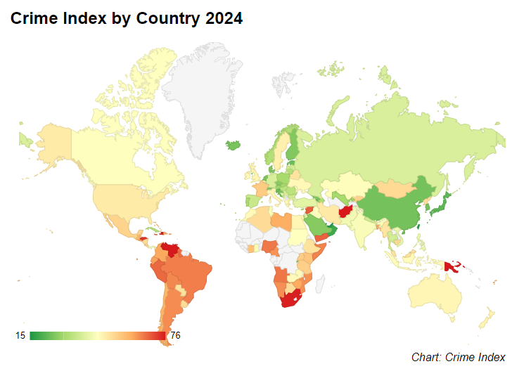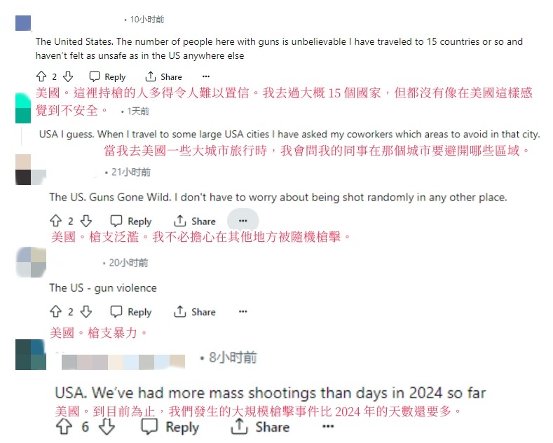 Numbeo網頁截圖 根據Numbeo公佈的2024年全球犯罪指數排名,前十名分別是委內瑞拉(81.2)、巴布亞新幾內亞、阿富汗、海地、南非、洪都拉斯、特立尼達和多巴哥共和國、叙利亞、也門、牙買加。 Numbeo數據庫自2009年開始發表相關年度報告,指數是根據調查造訪網站的訪客所得,犯罪指數與以下幾個方面的調查回復結果有關:對犯罪水平的一般看法、對安全感的調查反饋、對特定犯罪的擔憂、對財產犯罪的程度評估、對暴力犯罪的認知評估。犯罪水平低於20為非常低,犯罪水平高於80為非常高。中國香港2024年犯罪指數為21.8,排名140,中國內地2024年犯罪指數為24.9,排名131,均屬於犯罪水平低的範圍。 然而許多海外網友的關注點并不是“哪個國家最危險”,而是“哪些國家看似不危險,但實際上很危險”。 2月21日,在國外社交媒體網站Reddit上,有海外網友就此發帖,結果不少犯罪指數排名靠後的國家被海外網友頻頻點名,尤其是美國。 在Numbeo的名單中,美國2024年危險指數49.3,全球排名58,看似“平平無奇”,卻引來眾多海外網友吐槽。 不少網友留言道:“美國。到目前為止,我們發生的大規模槍擊事件比2024年的天數還要多。”“美國。槍支泛濫。我不必擔心在其他地方被隨機槍擊。”“當我去美國一些大城市旅行時,我會問我的同事在那個城市要避開哪些區域。”