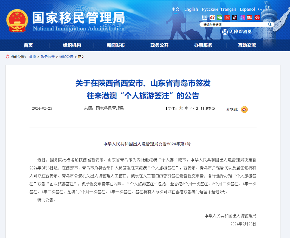 2月23日,中國出入境管理局發佈公告,決定自2024年3月6日起,在西安市、青島市為符合條件人員簽發往來港澳“個人旅遊簽注”。西安市、青島市戶籍居民以及居住證持有人可以在西安市、青島市公安機關出入境管理人工窗口,或設在人工窗口的智能簽注設備提交申請,自行選擇辦理“個人旅游簽注”或者“團隊旅遊簽注”,免予提交申請事由材料。“個人旅遊簽注”包括:赴香港3個月一次簽注、3個月二次簽注、1年一次簽注、1年二次簽注;赴澳門3個月一次簽注、1年一次簽注。簽注持有人每次可以在香港或者澳門逗留不超過7天。 (完) 【編輯:錢林霞】