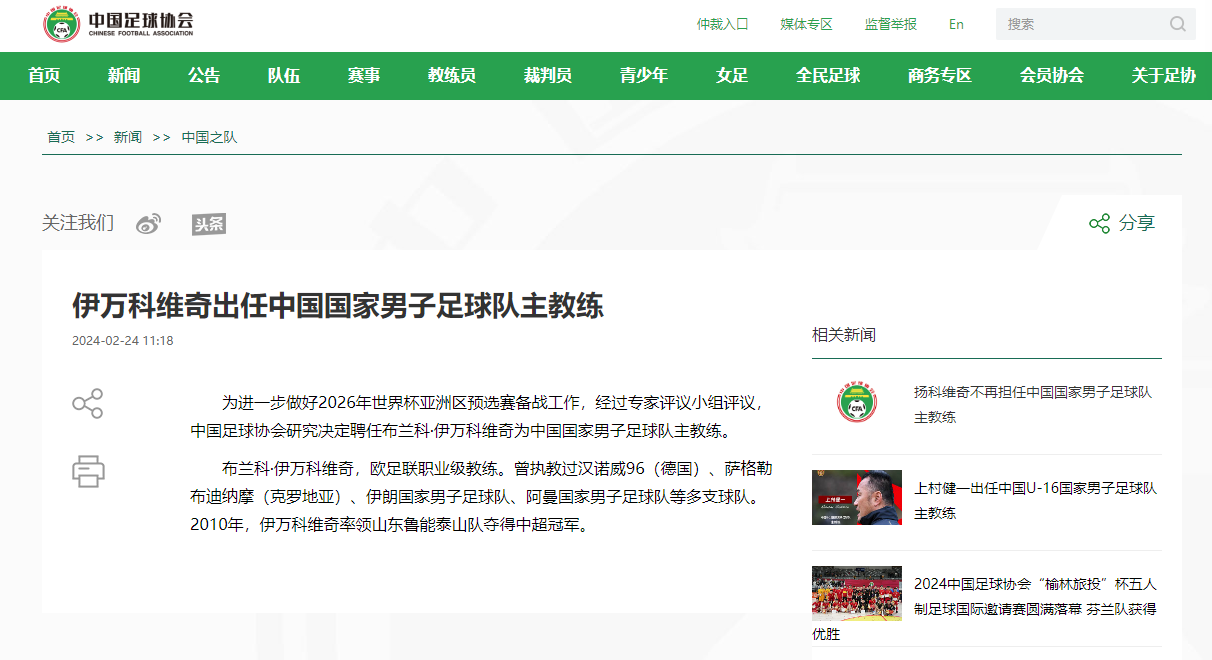 伊萬科維奇成為國足新任主帥。(中國足球協會網頁截圖) 中國足協同時在另一則公告中宣佈,2023卡塔爾亞洲杯結束後,由於中國男足未能晉級亞洲杯淘汰賽階段比賽,主教練及教練團隊的執教合同已根據約定自動終止,揚科維奇不再擔任中國男足主教練。 【編輯:李泺】