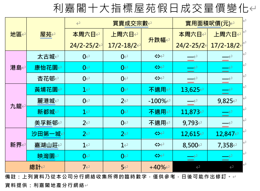 香港新聞網2月26日電 香港利嘉閣地產總裁廖偉強表示,新一份財政預算案將於28日公佈,發展商、業主及買家都靜待政府是否有樓市“減辣”措施推出,以及觀望政府會否有更多剌激經濟措施出台再作進一步部署,因此二手市場成交氣氛暫時仍然較淡靜。 綜合利嘉閣地產分行網絡數據,在過去的周六日(2月24至25日)十大指標屋苑錄得7宗二手成交,對比上個周六日(2月17至18日)合共錄得5宗成交上升,但仍處於個位宗數。 廖偉強指出,各大發展商在農曆年過後開始積極部署推出新盤,有項目更以低價推售,成功搶佔二手市場部份購買力。他相信,隨著財政預算案在周三揭曉後,不論是否有“減辣”或刺激措施出台,都能進一步為市場帶來明確的方向,相信下周六及日的二手成交易量將會出現明顯的上升。 在過去兩天的十大指標屋苑買賣當中,有5個屋苑錄得成交,表現較好的沙田第一城及美孚新邨,分別各錄2宗買賣;而黃埔花園、將軍澳新都城及天水圍嘉湖山莊則各錄1宗成交。
