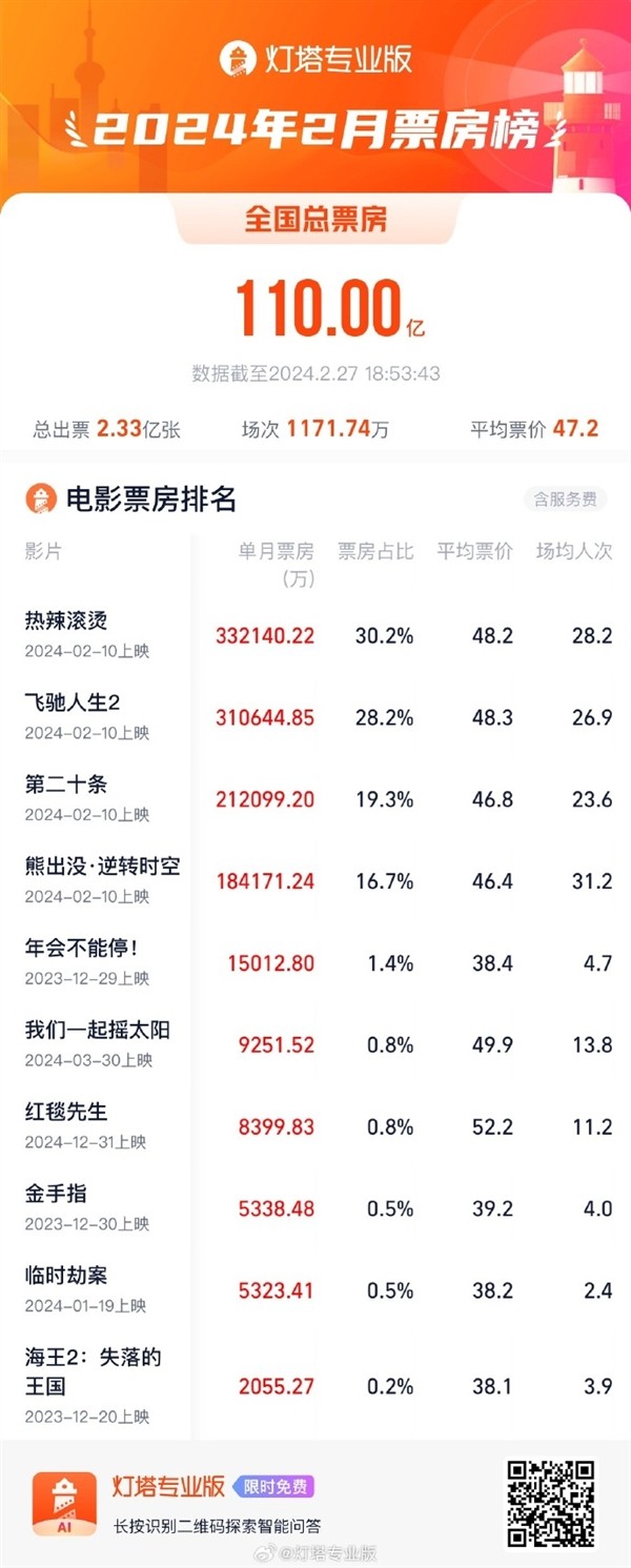 香港新聞網2月28日電 據燈塔專業版數據,截至昨(27日)18時53分,2024年2月總票房(含預售)破110億,《熱辣滾燙》票房仍居榜首。 本月票房也成為當前中國影史單月票房第三位,這也是中國影史第6次單月票房破100億。 本年度賀歲片《熱辣滾燙》票房高達33億仍居排名榜榜首,而緊隨其後的影片《飛馳人生2》票房超31億,排名第二,該票房進入中國影史票房TOP20。《飛馳人生2》接續前作《飛馳人生》的故事,講述張馳和朋友們重組車隊,跌跌撞撞地再次奔赴賽場的故事。第一部《飛馳人生》上映於2019年春節,該片最終票房收入17億,這也是喜劇、賽車等題材在影視領域首次取得如此高的票房。後來居上的影片《第二十條》連續8天獲得單日票房冠軍,目前《第二十條》累計票房已超21億元,預計總票房將超25億元。而包括香港影星劉德華主演的《紅毯先生》、《我們一起搖太陽》等三部影片退出角逐春節檔,另外排期。