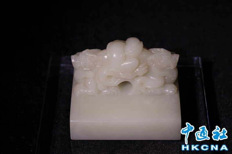 香港蘇富比中國藝術品春季拍賣系列(2024年4月)將呈獻清初白玉交龍鈕“乾隆御筆”寶璽,為現存世上最碩大白玉寶璽之一。(香港中通社記者 曹文毓攝) 中通社記者現場看到,寶璽色澤瑩潤柔白,未見一絲雜色;印章面約有成年人兩隻手一樣大,以陽文(表面凸起的文字)篆刻“乾隆御筆”四字。 除寶璽外,同場並獻乾隆御製“鑑古席珍”君臣冊,估價5000萬至7000萬港元。君臣冊有乾隆親手書寫的“朗照”二字,“朗照”對頁,是著名意大利傅教士郎世寧妙筆畫出的乾隆彩色肖像。君臣冊後頁,則有宮廷大師如董邦達、丁觀鵬等的繪畫作品,從山水、花鳥到人物,不一而足;冊上亦印有乾隆收藏並親筆注釋的古印,展現出清代宮廷文化底蘊。 同場尚有程思伉儷舊藏乾隆粉青釉浮雕海水立龍雙耳扁壺。扁壺色澤仿若青白泛藍的透亮翡翠,以浮雕形式於瓶身上展現龍騰身姿。浮雕雖淺,但層次分明;在燈光照射下,龍身陰影對比強烈,整條龍好似能從壺上躍然飛出。該扁壺又稱“抱月瓶”,估價3500萬至5500萬港元。
