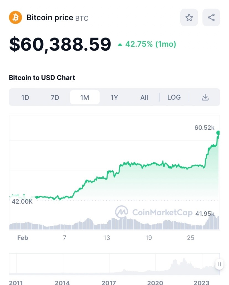香港新聞網2月29日電 昨晚(28日),比特幣價格突破6萬美元,日內漲超6%,近一個月漲幅超過40%,總市值達到近1.2萬億。據悉,上一次比特幣價格站上6萬美元,發生在2021年11月,距今已有28個月。