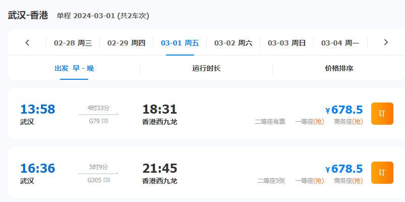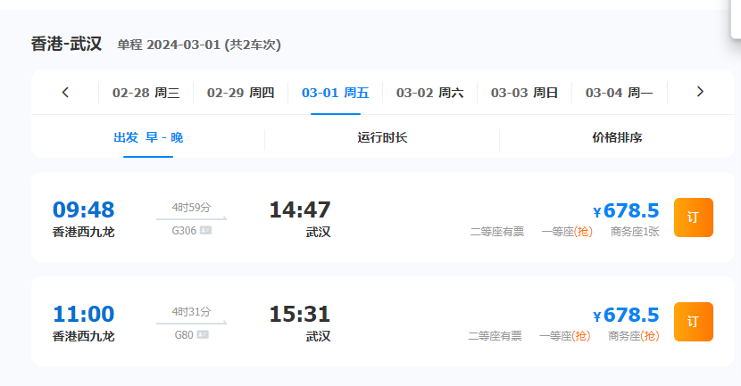 香港往返武漢一天有兩趟班次的車,可以隨心自由選擇,票價也不貴,一等價位1082.5元人民幣,二等票價位678.5元人民幣。可以選擇早上出發或中午出發,4個半小時後就到達武漢。