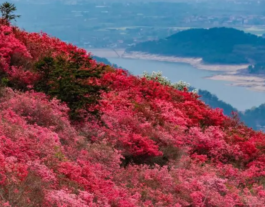 都知武漢櫻花美,不識黃陂杜鵑紅。位於武漢黃陂區的雲霧山四月最美的萬畝杜鵑花才剛剛開始,紅的似火,艶若雲霞。雲霧山位於武漢市黃陂區李家集街道泡桐店境內,自古以來就有“西陵勝地,漢地祖山”的美譽。春天的時候只見漫山遍野的杜鵑花如期綻放,在坳間,在山崖上,綠色和紅花相得益彰,一叢叢的綠,綠得青翠欲滴;一簇簇的紅,紅得像一片片火焰。滿山滿穀都是搖曳的彩色,風吹花浪滾滾,如雲似霞,大山以燦爛的姿態迎接春天的到來。