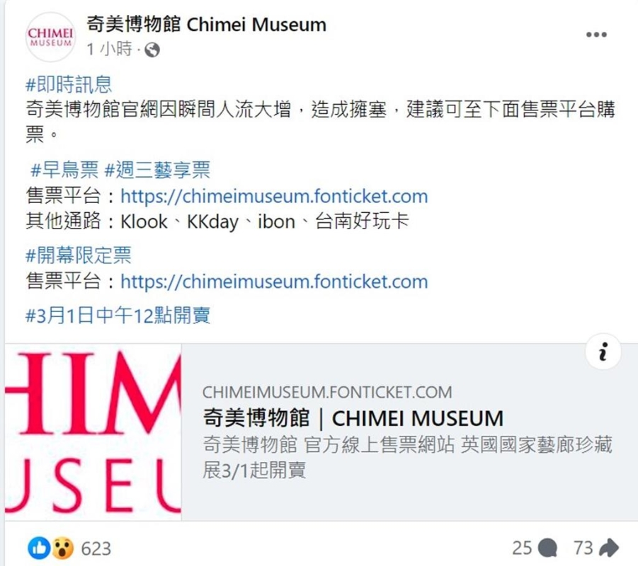 (奇美博物館臉書截圖) 館方發現官網10時起流量大增,雖加大頻寬仍然當機,緊急在臉書專頁公告附上購票平台連結,有上百位民眾上午9時許就直接到現場排隊搶票。 過去台南美術館2館的“殭屍展”也曾造成官網當機,奇美博物館這波展覽再掀熱潮。奇美博物館表示,館方過去也曾舉辦過2次大型藝術展覽,參觀者同樣踴躍,但從未發生官網當機狀況。 【編輯:黃璇】