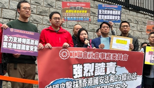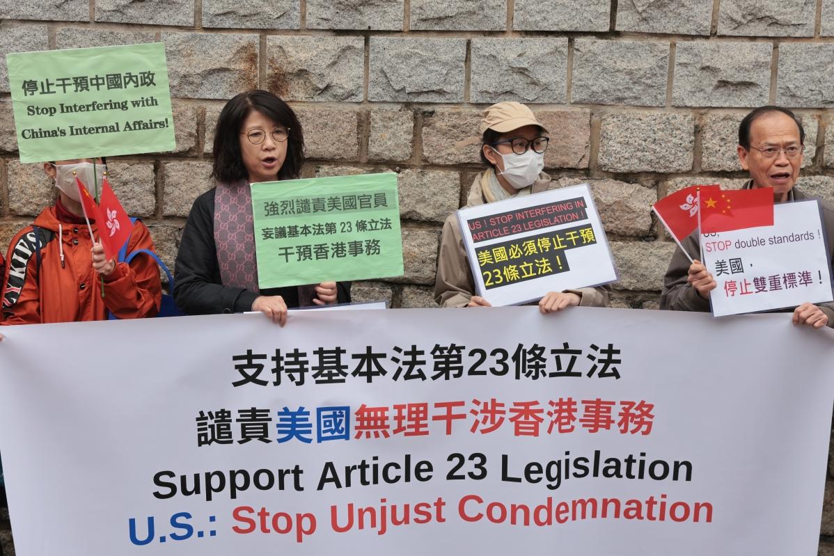3月2日,香港市民強烈譴責美國妄議抹黑基本法第23條立法 香港中通社圖片 香港特區政府完成為期一個月的基本法第23條立法公眾諮詢,在諮詢期間共收到逾1.3萬份意見,有近99%表示支持及提出正面意見。但美國政府卻就香港基本法第23條立法發表偏頗和具誤導性的言論,妄議香港的23條立法。 3月3日,有不少香港市民自發前往美國駐港澳總領事館外請願,高呼“強烈譴責美國駐港總領事攻撃抹黑香港”、“強烈要求美國立即停止說三道四、抹黑造謠”等口號,促請美國停止干預香港事務。據之前媒體報道,前兩日,亦有不少市民前往美國駐港澳總領事館外請願。 香港市民林先生表示,美國三番四次干預香港事務,不單指手畫腳,更抹黑造謠,偏頗誤導大眾。他認為,遵紀守法是每個在港民眾的基本義務,無違法之心,何懼之有,而完善維護國家安全的法律對普通民眾、遵紀守法之人是保護傘。至於香港國安法實施以來,社會安定、經濟復甦、安居樂業,發展形勢一片大好。他支持特區政府就基本法第23條立法,堅定守護香港繁榮穩定,鞏固香港營商與金融中心核心地位,強烈促請美國立即停止抹黑香港法治、停止插手干預香港事務。 另有市民代表強烈譴責美國駐港總領事梅儒瑞日前言論無理干涉中國內政,對香港事務說三道四,抹黑香港營商環境。他奉勸美國一些官員立即停止政治圖謀,停止以任何方式干預香港事務。(完) 【編輯:俞丹鳳】