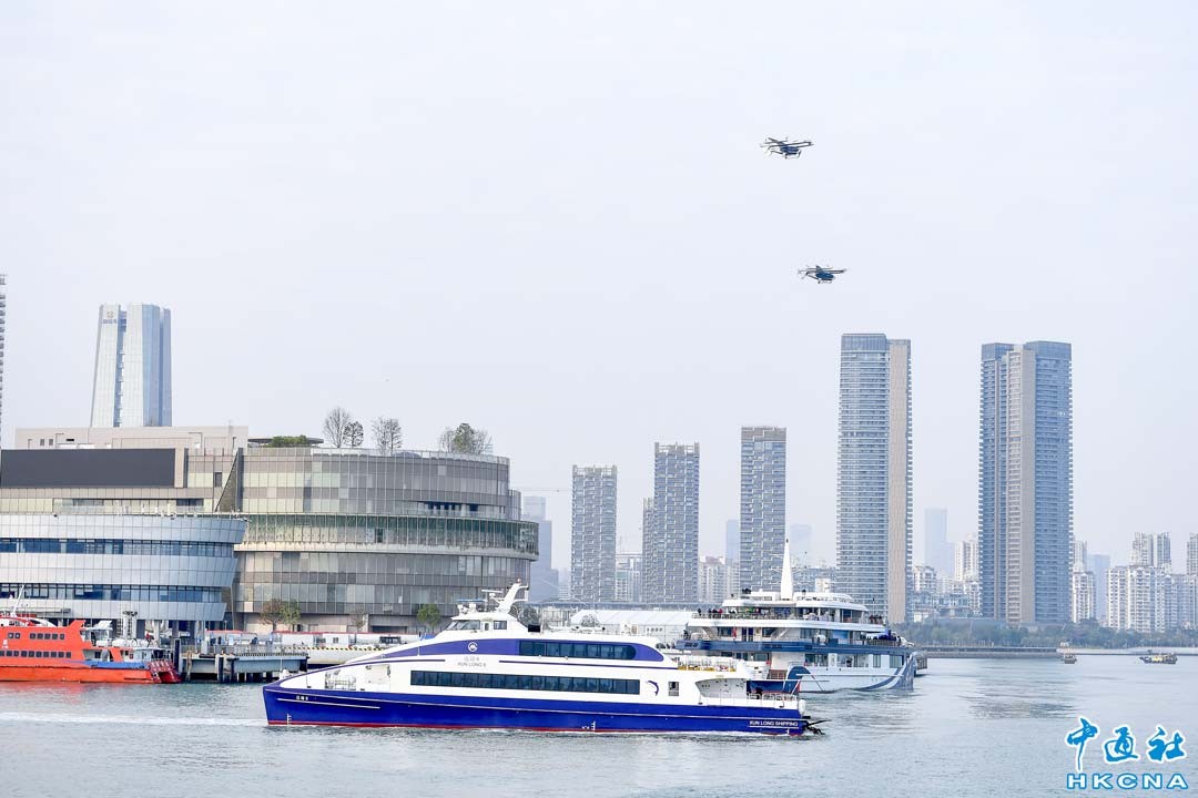 2月27日,全球首條eVT0L跨城跨灣航線(深圳-珠海)首次演示飛行在深圳蛇口郵輪中心舉行。深圳-珠海飛行超過55公裡,用時大約20分鐘。此次活動由峰飛航空科技自主研制的航空器eVTOL——“盛世龍”執飛,模擬從深圳蛇口郵輪母港前往珠海九洲港碼頭的出行場景。盛世龍—eVTOL載人航空器(又被稱為空中出租車),最大起飛重量2000公斤,最大載人數5位,巡航速度200公裡/小時,最大航程250公裡。(聞子 攝)