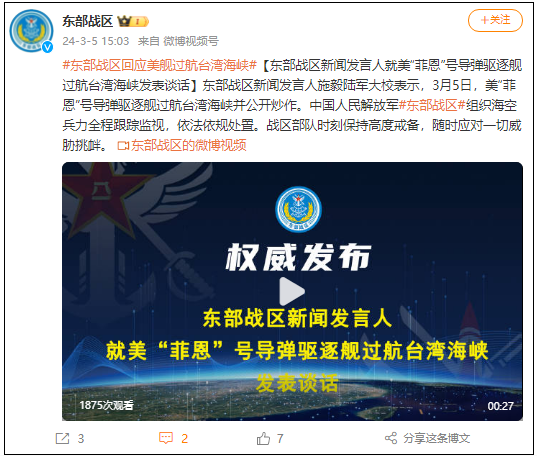 香港新聞網3月5日電 5日,東部戰區新聞發言人就美“菲恩”號導彈驅逐艦過航台灣海峽發表談話。