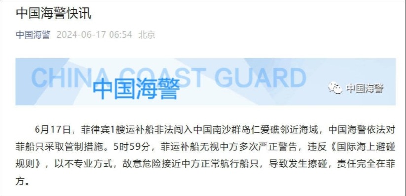 香港中通社3月6日電 據法新社等媒體報道,菲律賓5日指責中國海警在菲軍進行補給任務時進行“危險動作”,導致兩國船隻相撞,並造成4名菲律賓人受傷。對此,中國海警局新聞發言人5日回應稱,菲海警4407號船無視中方一再警告,違反《國際海上避碰規則》,以不專業、危險方式,故意衝撞中方正常執法的海警21555艇,導致發生輕微刮蹭,責任完全在菲方。