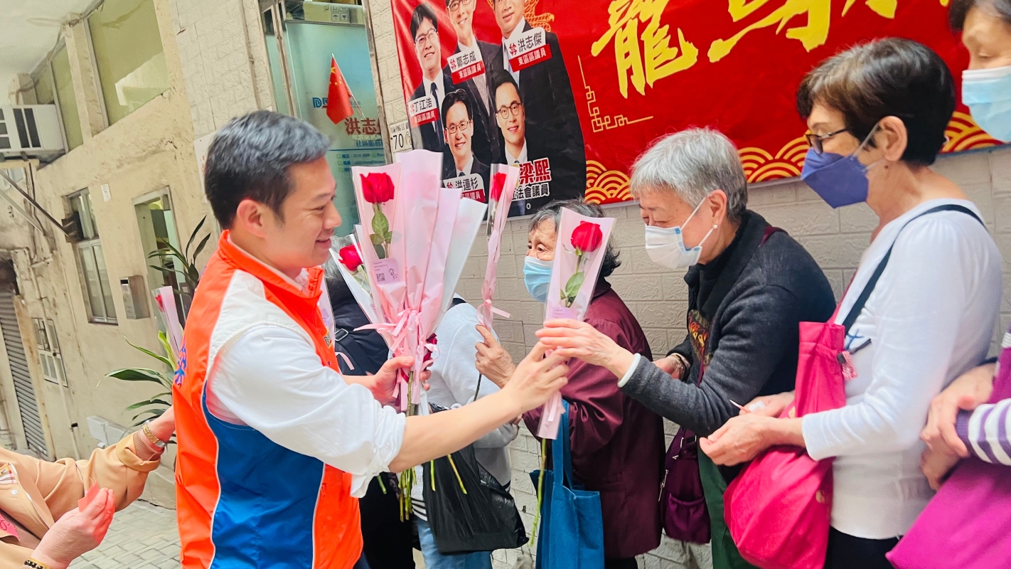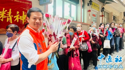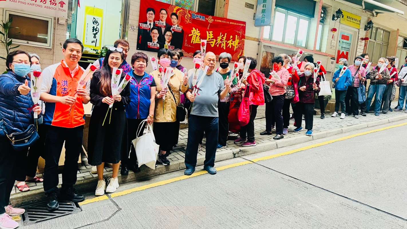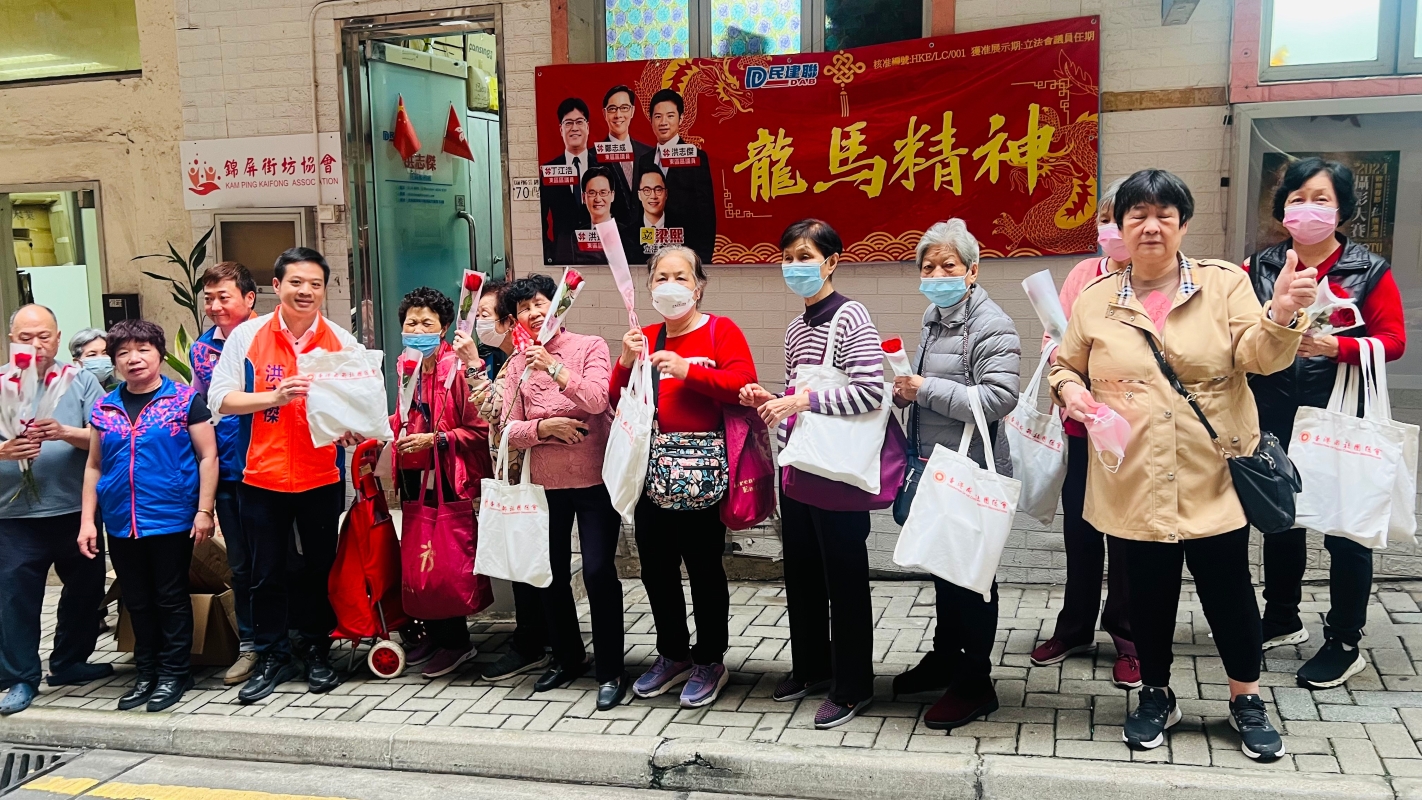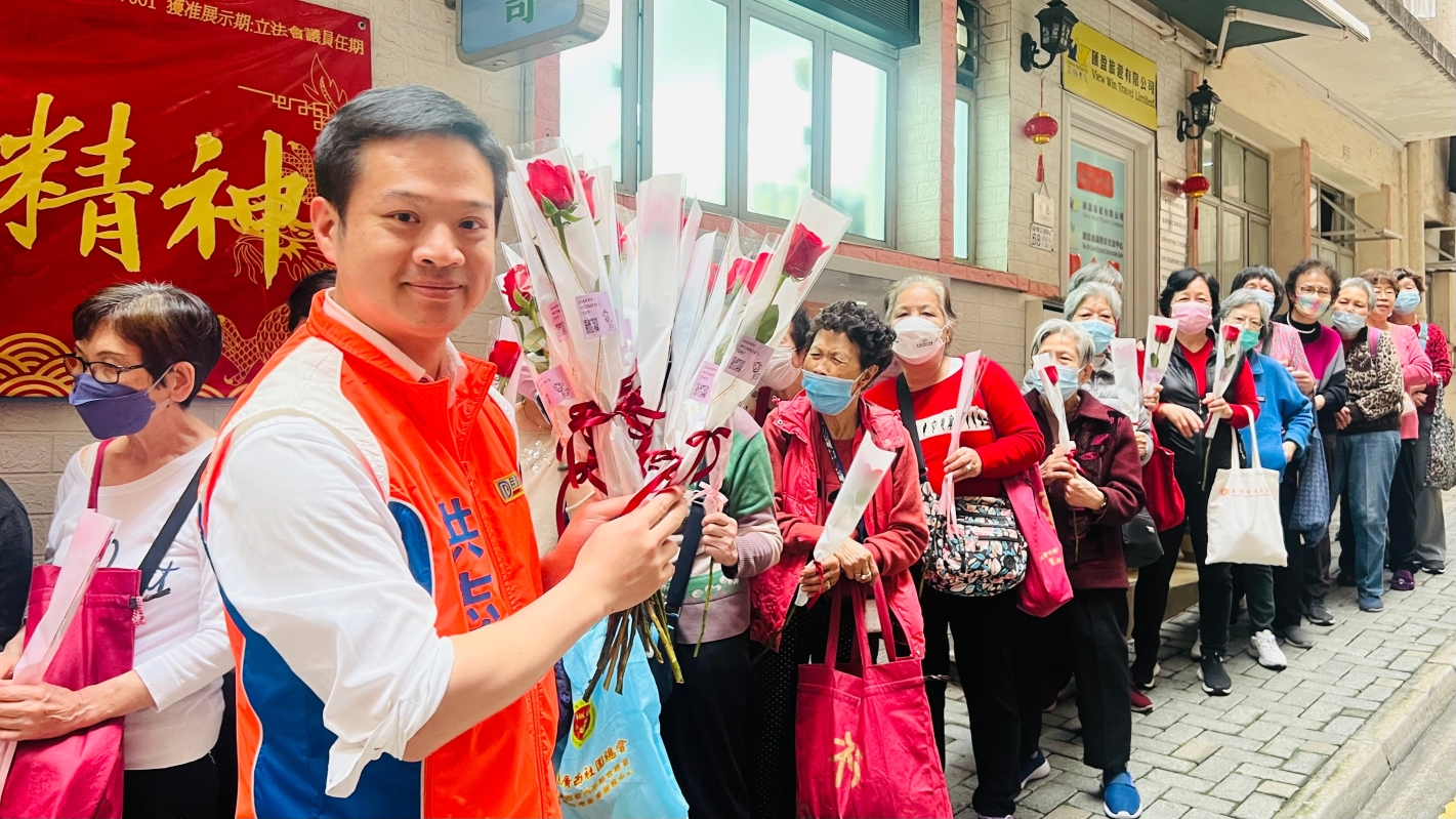香港成都社團總會聯同東區區議員洪志傑率先送上玫瑰花、沖劑和福袋予基層婦女
