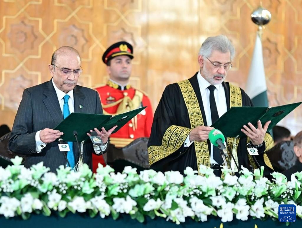 3月10日,在巴基斯坦伊斯蘭堡總統府,巴基斯坦最高法院首席大法官卡齊·法伊茲·伊薩(右)主持當選總統阿西夫·阿里·扎爾達裡的宣誓就職儀式。新華社發(巴基斯坦新聞與廣播部下轄媒體信息部門供圖) 這是扎爾達里第二次當選巴基斯坦總統。扎爾達里生於1955年,是巴基斯坦已故前總理貝·布托的丈夫,曾於2008年9月至2013年9月擔任巴總統。 巴基斯坦9日舉行總統選舉。來自人民黨和穆斯林聯盟(謝里夫派)的聯合候選人扎爾達里和來自“遜尼派團結委員會”的候選人馬哈茂德·汗·阿查克扎參與角逐,最終扎爾達里以411票,擊敗只取得181票的阿查克扎第二度當選總統。(完) 【編輯:梅婉潼】