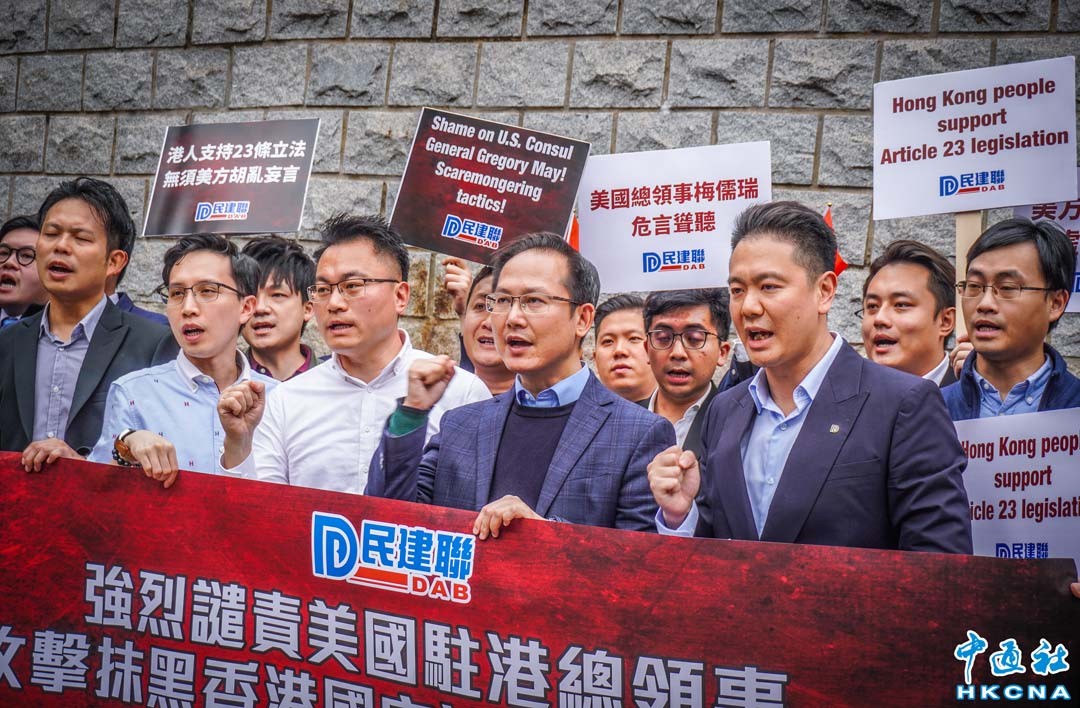 3月6日,香港民建聯成員一行在美國駐港總領事館前抗議,強烈譴責美國駐港總領事攻擊抹黑香港國安法和23條立法,干擾特區維護國家安全。(香港中通社記者 曹文毓攝)
