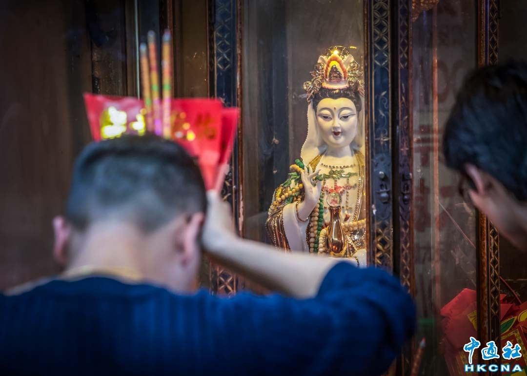3月5日晚上11時(農曆正月廿六子時)是“觀音開庫”的日子,全港16間廟宇可供善信“借庫”。借庫熱點的紅磡觀音廟,今年借庫利市金額由3000萬至10億不等,開始前已有上百名善信排隊等待。圖為市民拜觀音。(香港中通社記者 謝光磊攝)