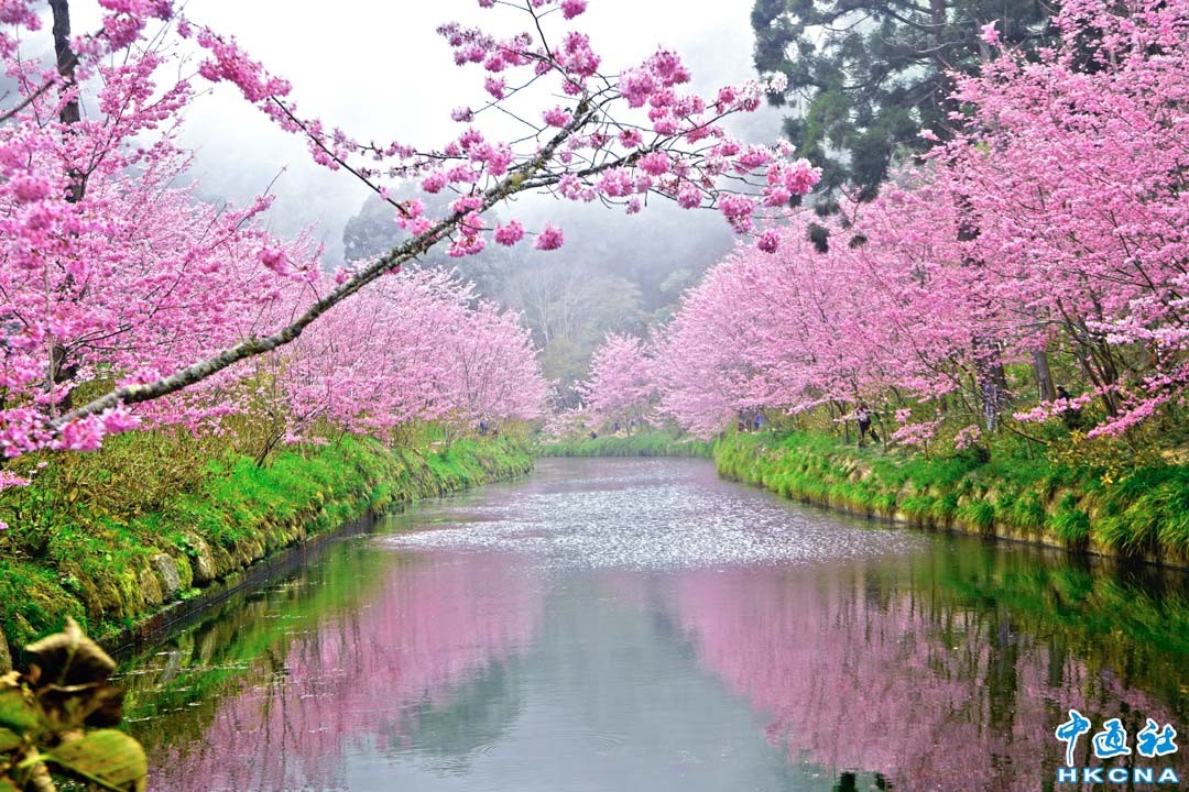 台灣南投縣鹿谷鄉杉林溪森林生態渡假園區,坐落在海拔高度1600公尺至1800公尺之間,3月粉紅櫻花綻放,獨步全台最美河岸櫻花,倒映水景美如畫,雲霧繚繞,宛如仙境的美景,除了櫻花之外,花卉中心還有美麗的鬱金香及牡丹,顏色多種,吸引許多遊客前往拍照打卡。 香港中通社圖片