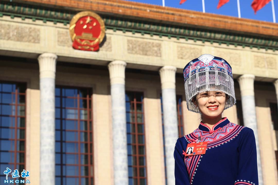 3月8日,“三八”國際婦女節,十四屆全國人大二次會議在北京人民大會堂舉行第二次全體會議。圖為湖北代表團的張琼麗身著民族服飾出席會議。(香港中通社記者 許其皓攝)