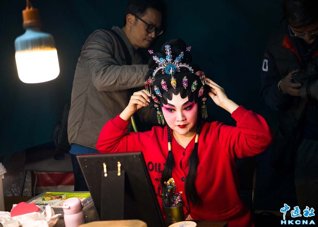 3月9日,演員在後台化妝。當日,二零二四甲辰年澳門雀仔園賀土地誕系列活動之賀誕粵劇神功戲首場開鑼,由江門市新會區青年粵劇團擔綱演出“南唐李後主”,免費接待市民、街坊觀賞。香港中通社圖片