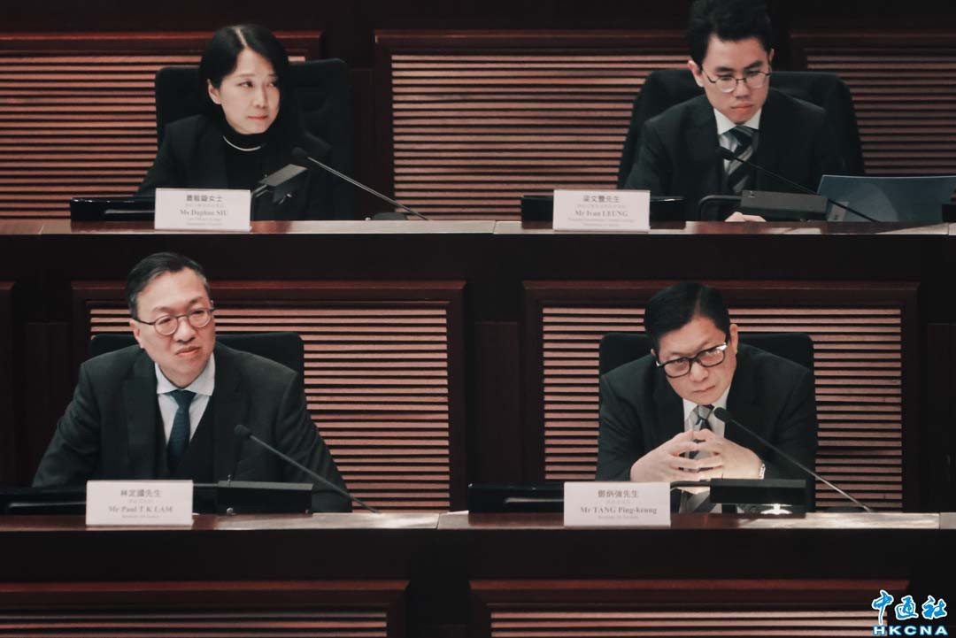 《維護國家安全條例草案》3月8日在立法會會議上進行了首讀和二讀。為此,相關的法案委員會一連多日加開會議,以加快審議工作。3月10日,立法會《維護國家安全條例草案》委員會加開4場會議,繼續討論條文內容,兩日半一共召開20小時會議。圖為香港特區政府律政司司長林定國及保安局局長鄧炳強等出席會議。(香港中通社記者 謝光磊攝)