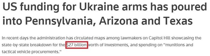 今日俄羅斯電視台網站報道截圖 美國援烏方面“一個保守得最好的秘密” 這可不是美國政客第一次這麼說了。 自去年10月進入本財年、拜登政府向國會提出涵蓋新財年對外軍事援助的一攬子撥款提案後,白宮便開始認真推銷起“戰爭經濟學”。 在當時為此發表的演講中,拜登提出了向烏克蘭和以色列提供武器彈藥和其他軍事物資的新理由:許多這類物資都是在美國製造的——這有利於美國的就業。 在此基調下,白宮高官紛紛使出渾身解數,對“軍工促繁榮”的道理進行了不遺餘力的宣傳: 去年11月,白宮官員向國會議員散發了一份“軍援烏克蘭受益州”分布圖,首次詳細列出大約270億美元對烏軍援資金如何轉化為對美國數十個州的軍工業投資。