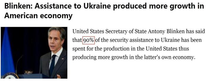 路透社報道截圖 在去年12月初舉行的里根國防論壇上,美防長奧斯汀發言時稱,為了支持烏克蘭,五角大樓未來近500億美元的額外軍事預算將用於更新改造美國30多個州的國防工業基地,這將創造或支撐數萬個“優質就業機會”。 同樣是在去年12月,美國務卿布林肯在與英國外交大臣卡梅倫召開的聯合記者會上也大說實話:美國援烏資金其實有90%用於在本土生產供應烏克蘭的武器裝備,這將為美國創造更多就業機會,讓美國經濟受益。