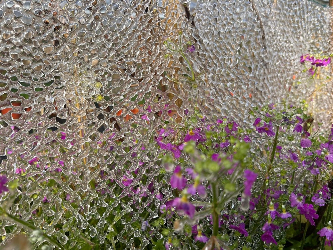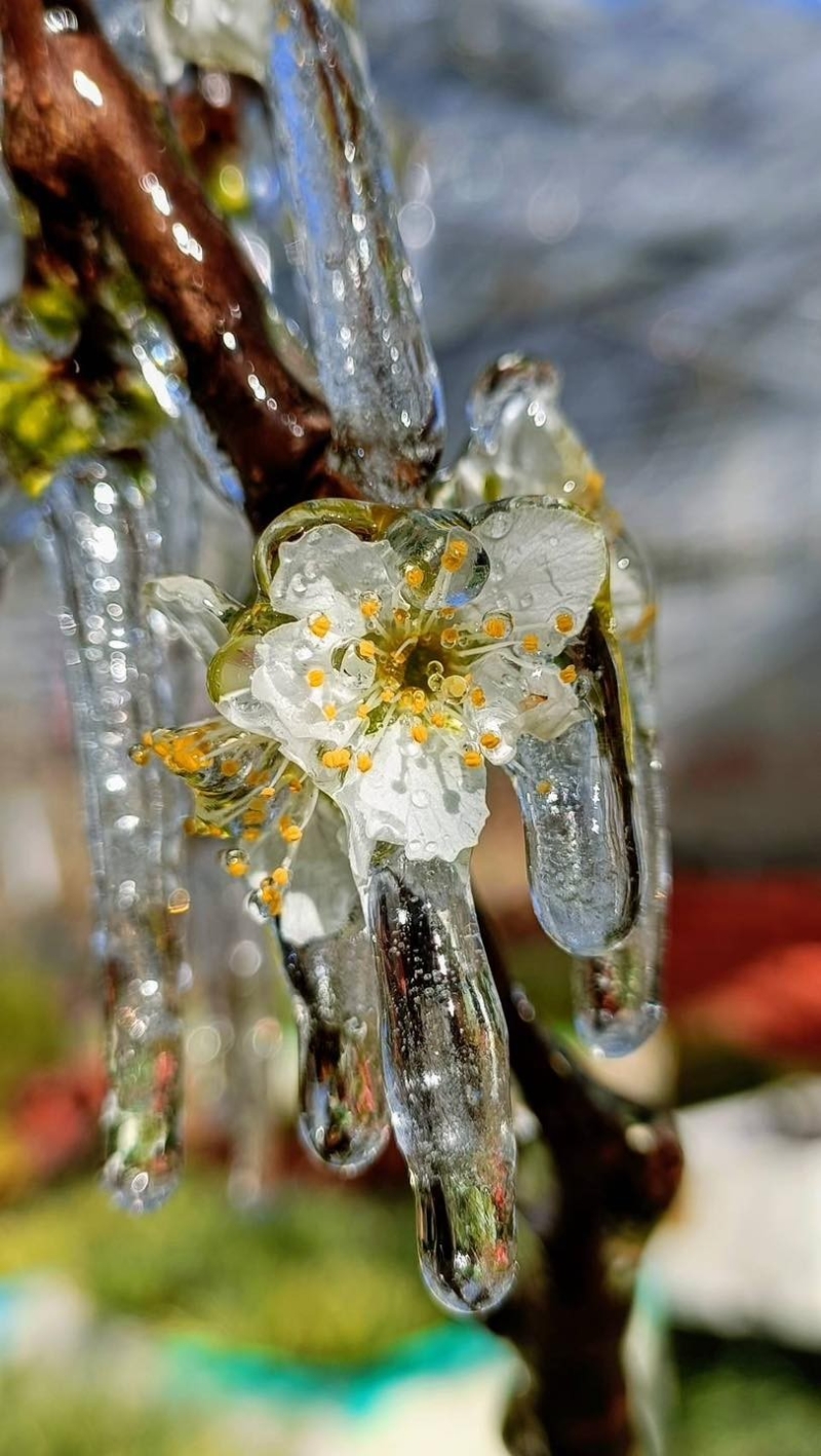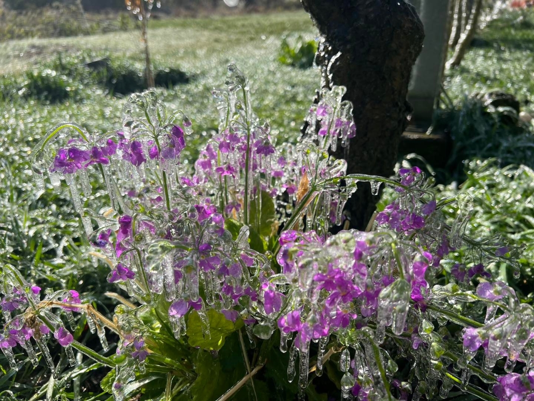 (圖片:武陵農場) 武陵農場表示,今天清晨農場出現負0.6攝氏度低溫,農場的水果藤架區,因噴灌系統灑水作業,加上零下低溫形成網狀冰柱狀的“水晶捕夢網”,如同知名電影《魔雪奇緣》裡的夢幻城堡場景。 現正值粉紫色櫻草花、潔白李花盛開,滴灌下的水珠經過整夜零下低溫,將櫻草花與李花凍成花卉冰塊,恰好將盛開花朵的豔麗時期短暫封存,員工分享,今早太陽露臉、溫度升高,花卉冰塊逐漸融化,落下滴滴水珠,花瓣沾著水痕,沐浴著陽光閃閃發亮,這是高山獨有的賞花雅緻。 (完) 【編輯:黃璇】