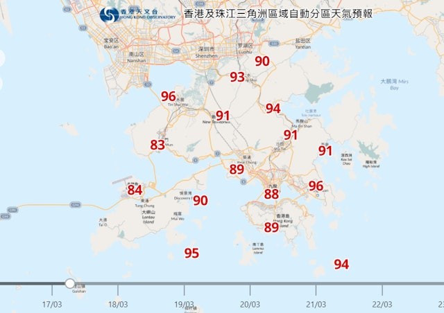 香港天文台料17日早多達11區相對濕度達90%。香港天文台截圖 據分區預測顯示,17日早上7時,本港11區濕度達90%或以上,包括流浮山、上水、打鼓嶺、石崗、大埔、沙田、西貢、長洲、橫瀾島、將軍澳、坪洲,天文台料相對濕度100%的天氣,或維持兩天至下周一(18日)。(完) 【編輯:許豐悅】