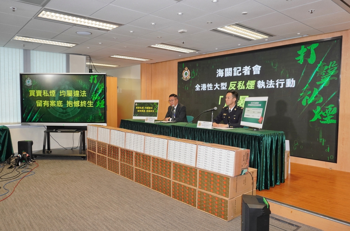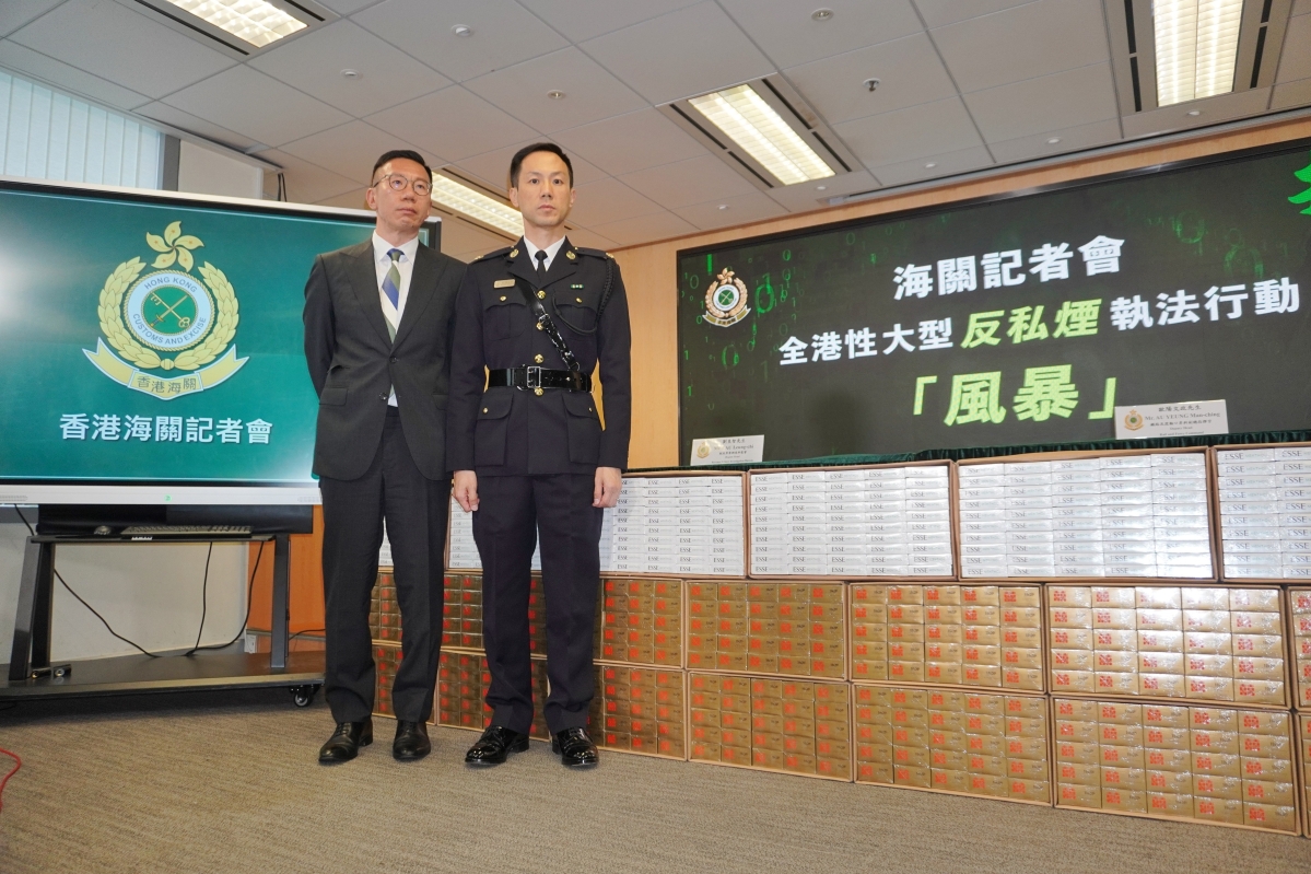 香港海關稅收罪案調查科監督劉良智和海關鐵路及渡輪口岸科副總指揮官歐陽文政在海關總部大樓舉行記者會