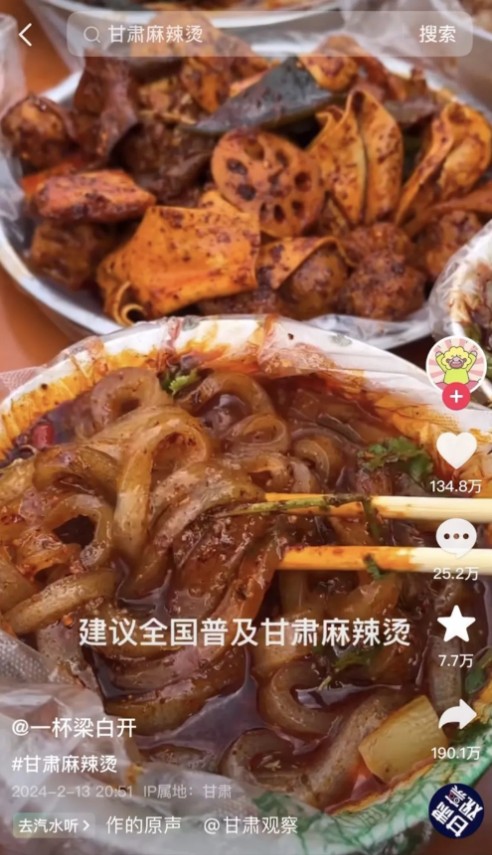 2月13日,網友“一杯梁白開”分享了第一個天水麻辣燙的視頻,視頻裡色澤誘人、熱辣滾燙,短時間內收穫190多萬次轉發。