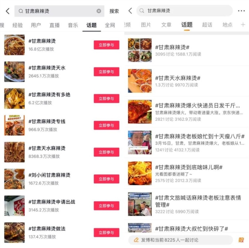 與甘肅麻辣燙相關的視頻在社交平台上累計播放量超過10億次,足見其火爆程度。左為抖音截圖,右為微博截圖。 距離淄博燒烤的爆火還不到一年,最近,甘肅天水麻辣燙登上各大社交平台的熱搜榜,吸引了不少遠道而來的食客和美食博主。有網友調侃:“上一次這麼多人在天水幹飯,還是漢武帝打匈奴支灶台的時候。” 縱觀最近幾年中國各地的文旅,解筱文分析,能被這“潑天富貴”“臨幸”的要訣在於六個字:天時、地利、人和,缺一不可。 解筱文指,中國文旅產業正處於一個黃金發展期,國家政策的大力支持和市場需求的持續增長共同構築了一個良好的發展環境,這是“天時”,是一個城市走紅的起點。“地利”是文旅發展的基礎,他重點強調連接一個城市的交通基礎設施,而天水的文旅稟賦就很不錯,雖然地處中國大西北,但擁有高鐵、機場,在對外交通上具有一定優勢。“一個城市即使有再好的自然稟賦和先天因素,如果沒有便捷高效的交通基礎設置做支撐,也只能望洋興嘆。通高鐵的城市,必然就具有先決優勢。如果這個城市再擁有機場,那麼就更是如虎添翼。”解筱文道。 而政通“人和”意味著政府支持力度大,旅遊服務質量高。在淄博燒烤的火爆背後,離不開當地政府的大力支持和推廣;而在哈爾濱冰雪的發展過程中,也得益於政府對旅遊產業的高度重視和投入;天水麻辣燙也一樣,整個甘肅都在傾力支持,不遺餘力地開啟“寵粉”模式,讓公眾感受到了這座西北小城的滿滿誠意。