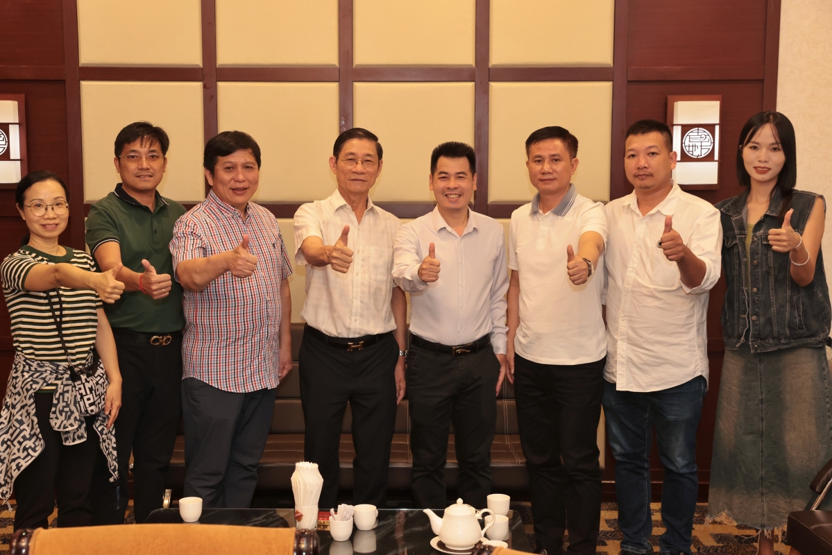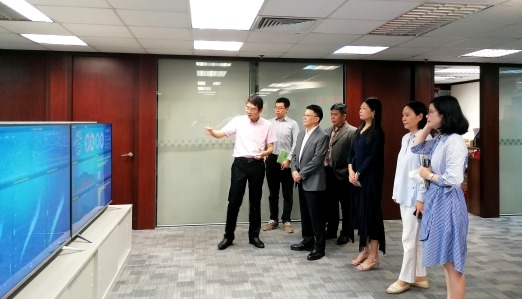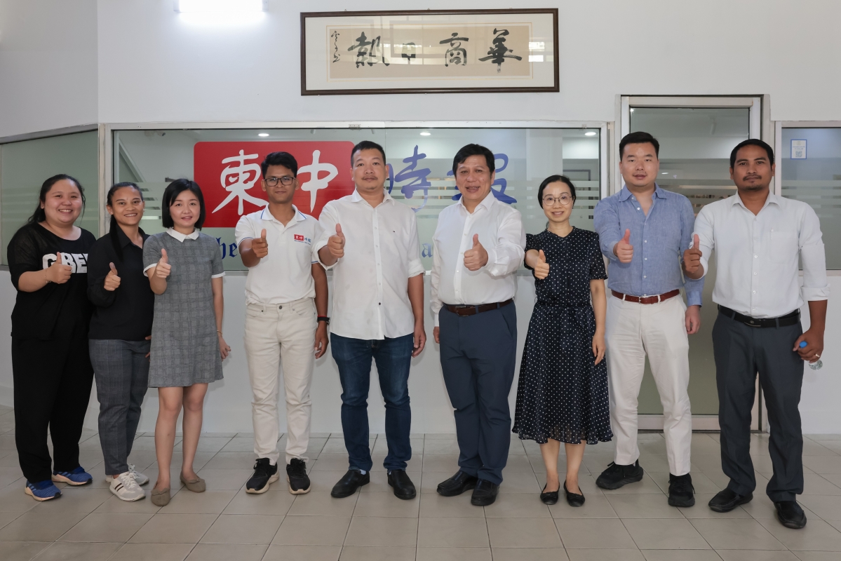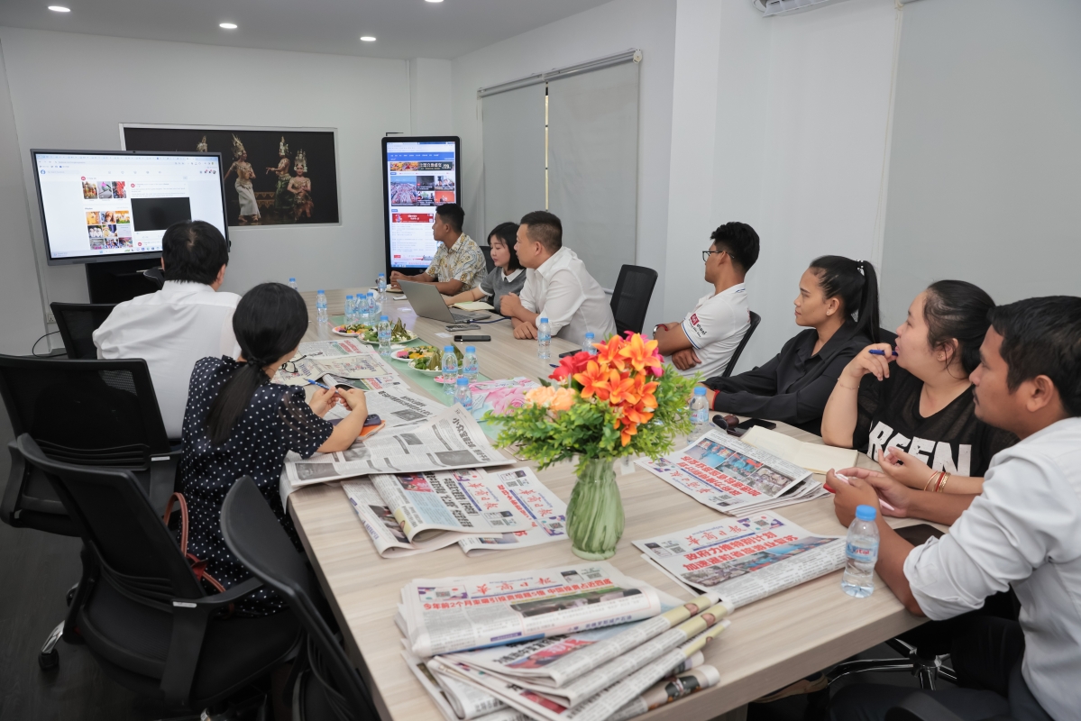 圖為香港中通社代表團拜訪華商日報和柬中時報,並與該報總編輯阮志強(中)、副總編輯黃如麗(左三)等交流。