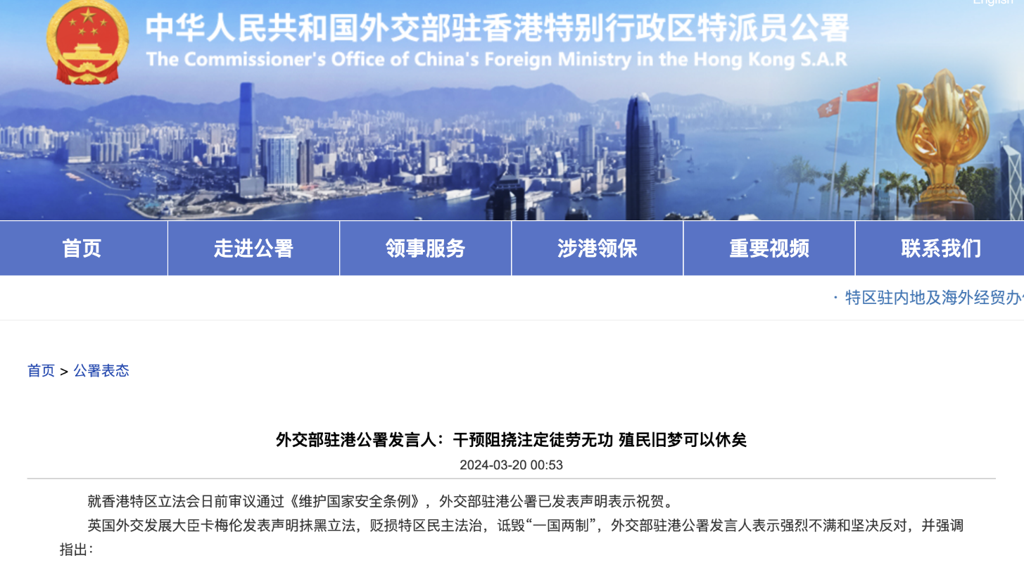 香港新聞網3月20日電 就香港特區立法會日前審議通過《維護國家安全條例》,外交部駐港公署已發表聲明表示祝賀。