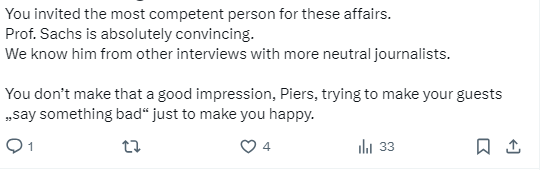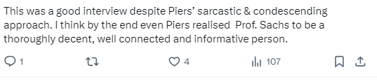 圖源網絡 也有網友說,薩克斯教授一如既往地彬彬有禮,皮爾斯的訪談風格居高臨下。