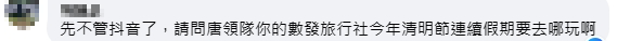 還有網友嘲諷:“先不管抖音了,請問唐領隊你的數發旅行社今年清明節連續假期要去哪玩啊?”