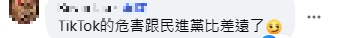 也有網友把矛頭直指民進黨當局:“Tik Tok的危害跟民進黨比差遠了”、“台灣最大的危害加災難產品應該是民退黨吧!”