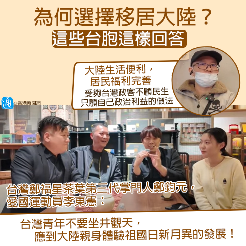香港新聞網3月26日電 近年來,台灣綠營不遺餘力抹黑大陸,但越來越多台胞用腳投票,選擇回到祖國安居樂業。當問及移居大陸的理由,不少台胞認為大陸發展日新月異,擁有更多發展機會,社會福利也更加完善。 台灣網紅“寒國人”近日在其YouTube頻道接連發布多條與台胞移居大陸相關的內容,採訪多位台胞移居大陸的經歷及原因,並呼籲台灣青年多來大陸走走看看,不要活在民進黨當局編造的謊言當中。 “鄧哥”就是移居大陸的台胞之一。他在影片中透露,自己已經賣掉台灣的房產,帶著媽媽移居廈門生活。他誇讚在大陸生活非常便利,居民福利也很完善,他憑居住證和台胞證即可在大陸辦理居民醫保,帶媽媽在醫院看病可用醫保報銷一部分。 他還表示,自從在大陸學會網購之後,每天都在瘋狂買買買。自己的衣服、電子產品,包括媽媽使用的輪椅、醫療設備等都非常便宜。 當問及賣掉台灣房產的原因時,“鄧哥”失望表示,已經受夠台灣政客不顧民生只顧自己政治利益的做法,認為這樣下去台灣未來堪憂…… 除了“鄧哥”之外,“寒國人”還採訪了台灣鄭福星茶葉第三代掌門人鄭鈞元,以及愛國運動員李東憲,詢問他們在大陸發展的情況。 鄭鈞元如今長期在廈門發展,他表示在近10位台灣青年在自己公司工作,他們剛開始都是抱著試試看的心態來到廈門,直到慢慢愛上這裡,最後選擇在大陸扎根。鄭鈞元曾問這些年輕人想不想回台灣,他們紛紛表示:“不是不愛台灣,而是更愛祖國。” 鄭鈞元去年底接受傳媒採訪時透露,“鄭福星”總部從台灣遷到大陸後,成本降低了50%,營業額增長20倍,幾乎都是大陸訂單。 而曾因在國際賽事上舉起五星紅旗而遭綠營網暴的台籍跆拳道運動員李東憲,如今在江蘇南通發展。他透露自己在南通開了一家跆拳道館,同時也在做線上帶貨的工作,希望可以進一步帶動傳統產業的升級。 被問及為何去南通發展時,李東憲認為大陸幅員遼闊,除了福建之外,也想深入到地方去看看,挖掘更多適合台胞生活的環境。 當聊到大陸和台灣兩地薪資水平的時候,李東憲表示自己請一位跆拳道教練最起碼要八千元人民幣,鄭鈞元也透露其廈門公司台籍幹部薪資是台灣分公司的三到四倍。他們呼籲台灣青年不要坐井觀天,到大陸來走一走看一看,在更大的舞台發光發熱。 李東憲補充,想要來大陸非常簡單,只需要辦好電話卡、銀行卡,開通線上支付後便可在全國暢行無阻。