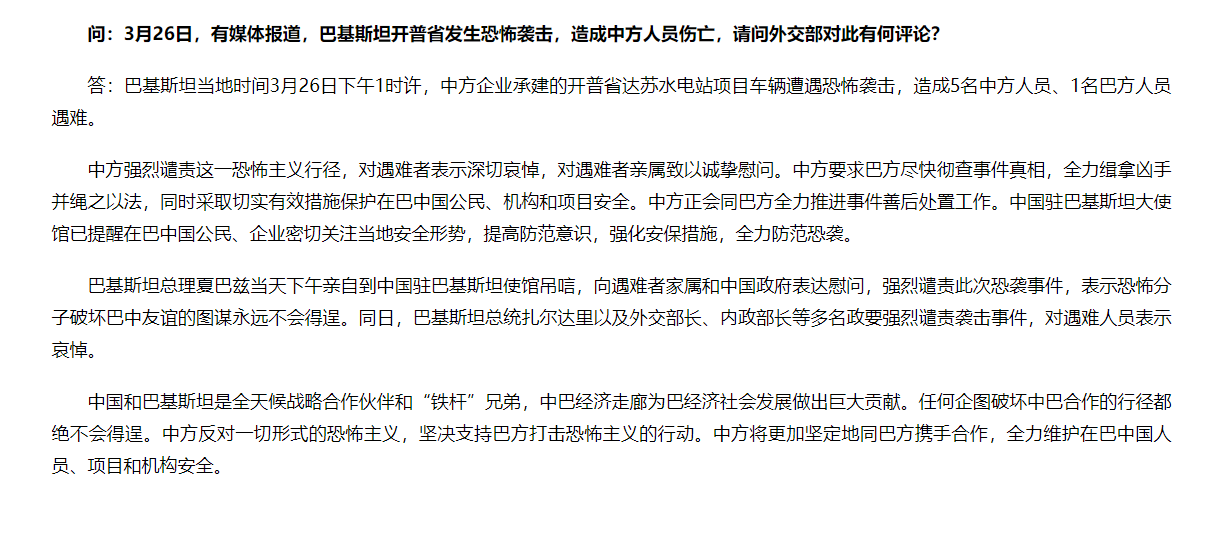 中國外交部網站截圖 問:3月26日,有媒體報道,巴基斯坦開普省發生恐怖襲擊,造成中方人員傷亡,請問外交部對此有何評論? 答:巴基斯坦當地時間3月26日下午1時許,中方企業承建的開普省達蘇水電站項目車輛遭遇恐怖襲擊,造成5名中方人員、1名巴方人員遇難。 中方強烈譴責這一恐怖主義行徑,對遇難者表示深切哀悼,對遇難者親屬致以誠摯慰問。中方要求巴方盡快徹查事件真相,全力緝拿凶手并繩之以法,同時採取切實有效措施保護在巴中國公民、機構和項目安全。中方正會同巴方全力推進事件善後處置工作。中國駐巴基斯坦大使館已提醒在巴中國公民、企業密切關注當地安全形勢,提高防範意識,強化安保措施,全力防範恐襲。 巴基斯坦總理夏巴茲當天下午親自到中國駐巴基斯坦使館吊唁,向遇難者家屬和中國政府表達慰問,強烈譴責此次恐襲事件,表示恐怖分子破壞巴中友誼的圖謀永遠不會得逞。同日,巴基斯坦總統扎爾達里以及外交部長、內政部長等多名政要強烈譴責襲擊事件,對遇難人員表示哀悼。 中國和巴基斯坦是全天候戰略合作夥伴和“鐵桿”兄弟,中巴經濟走廊為巴經濟社會發展做出巨大貢獻。任何企圖破壞中巴合作的行徑都絕不會得逞。中方反對一切形式的恐怖主義,堅決支持巴方打擊恐怖主義的行動。中方將更加堅定地同巴方攜手合作,全力維護在巴中國人員、項目和機構安全。(完) 【編輯:胡雪石】