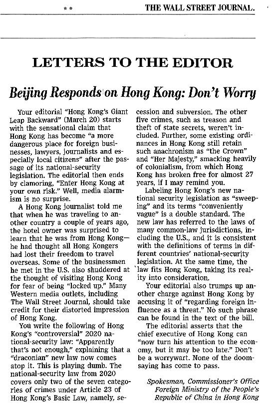 香港新聞網3月29日電  3月28日,《華爾街日報》刊登外交部駐港公署發言人致該報信函。信函駁斥該報社論日前抹黑香港《維護國家安全條例》、唱衰香港發展前景的惡劣言論,闡明香港基本法第23條立法的必要性、重要性和正當性。