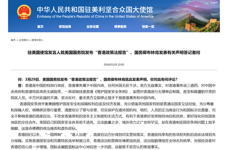 中國駐美使館網站截圖 問:3月29日,美國國務院發佈“香港政策法報告”,國務卿布林肯就此發表聲明。你對此有何評論? 答:香港是中國的特別行政區,香港事務屬於中國內政,任何外國無權干涉。美方無視事實,對香港事務說三道四,對中國中央政府和香港特區政府無端指責,一再詆毀抹黑香港《維護國家安全條例》,妄圖對香港進行無理單邊制裁,甚至制裁履職盡責的特區人員。中方對此強烈不滿,堅決反對,要求美方立即停止插手干預香港事務和中國內政。 香港國安條例平衡兼顧維護國家安全和保障權利自由及經濟發展,充分借鑒其他國家特別是普通法國家立法經驗,充分尊重和保障人權,明確界定罪行要素,清楚劃分了罪與非罪,切實保護在港外國機構、組織、人員的正當商業行為和國際交往需要,完全不影響香港的高度自治,不改變香港原有的資本主義制度和生活方式,有利於香港更好發揮獨特地位和優勢,更好深化同各國各地區的交往合作。美國自己的國家安全體系密不透風,立法數量之多、域外效力之廣世所罕見,卻在香港制定國安條例問題上指手畫腳,這是赤裸裸的政治操弄和虛偽雙標。 香港回歸以來,“一國兩制”、“港人治港”、高度自治方針得到切實貫徹落實,香港居民享有的各項權利和自由依法得到充分保障。實施香港國安法和完善特區選舉制度以來,香港法治和營商環境更加優良,法治指數繼續在全球名列前茅,外國投資者對香港的信心進一步增強,國際金融貿易航運中心地位進一步鞏固,這都是不容否認的客觀事實。 中國政府維護國家主權、安全、發展利益的決心堅定不移,貫徹“一國兩制”方針的決心堅定不移。我們敦促美方切實尊重中國主權和香港法治,恪守國際法原則和國際關係基本準則,立即停止插手香港事務、停止干涉中國內政。(完) 【編輯:許豐悅】