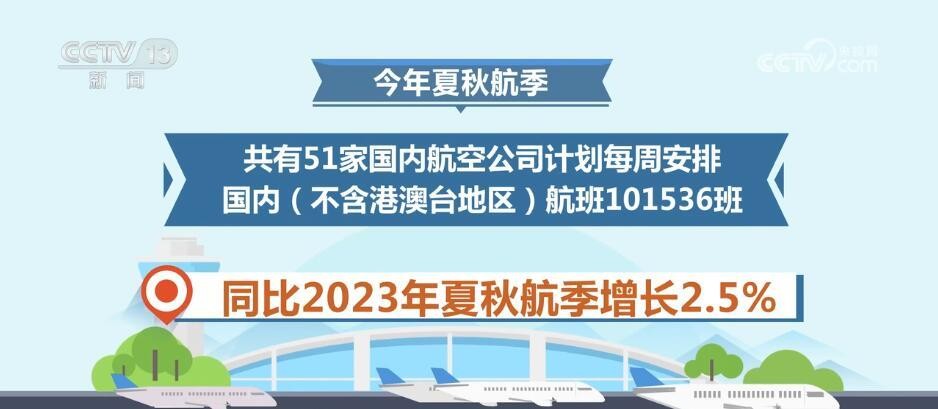 今年夏秋航季,共有51家國內航空公司計劃每周安排國內(不含港澳台地區)航班101536班,同比2023年夏秋航季增長2.5%。其中,客運航班每周98655班,同比2023年夏秋航季增長2.17%。在新開闢航線方面,35家航空公司在新開的國內683條獨飛航線上每周共安排6529個航班運營,主要包括中衛、吐魯番、庫車等支線機場與北京、上海、廣州、成都等樞紐機場間的干支銜接航線和支線航線。