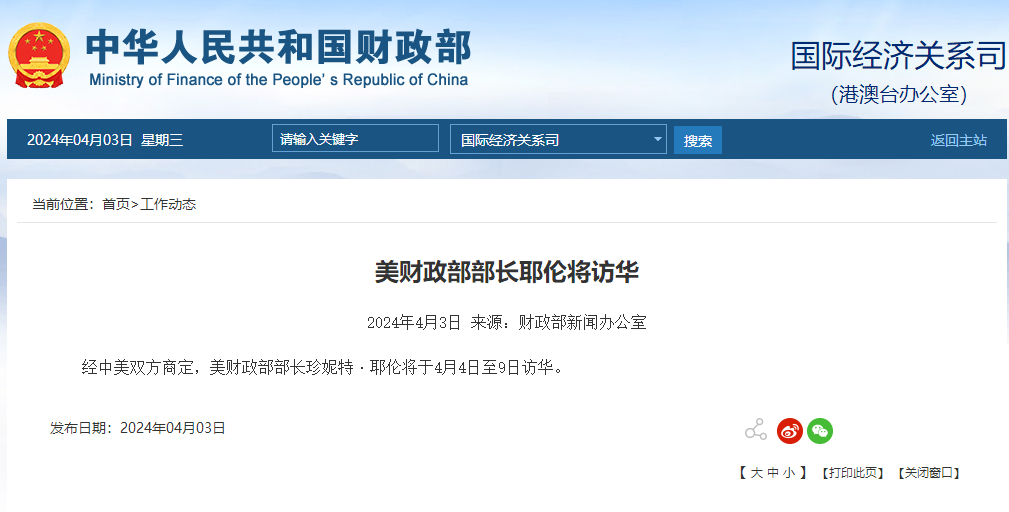 香港新聞網4月3日電 據中國財政部新聞辦公室4月3日消息,經中美雙方商定,美財政部部長珍妮特·耶倫將於4月4日至9日訪華。