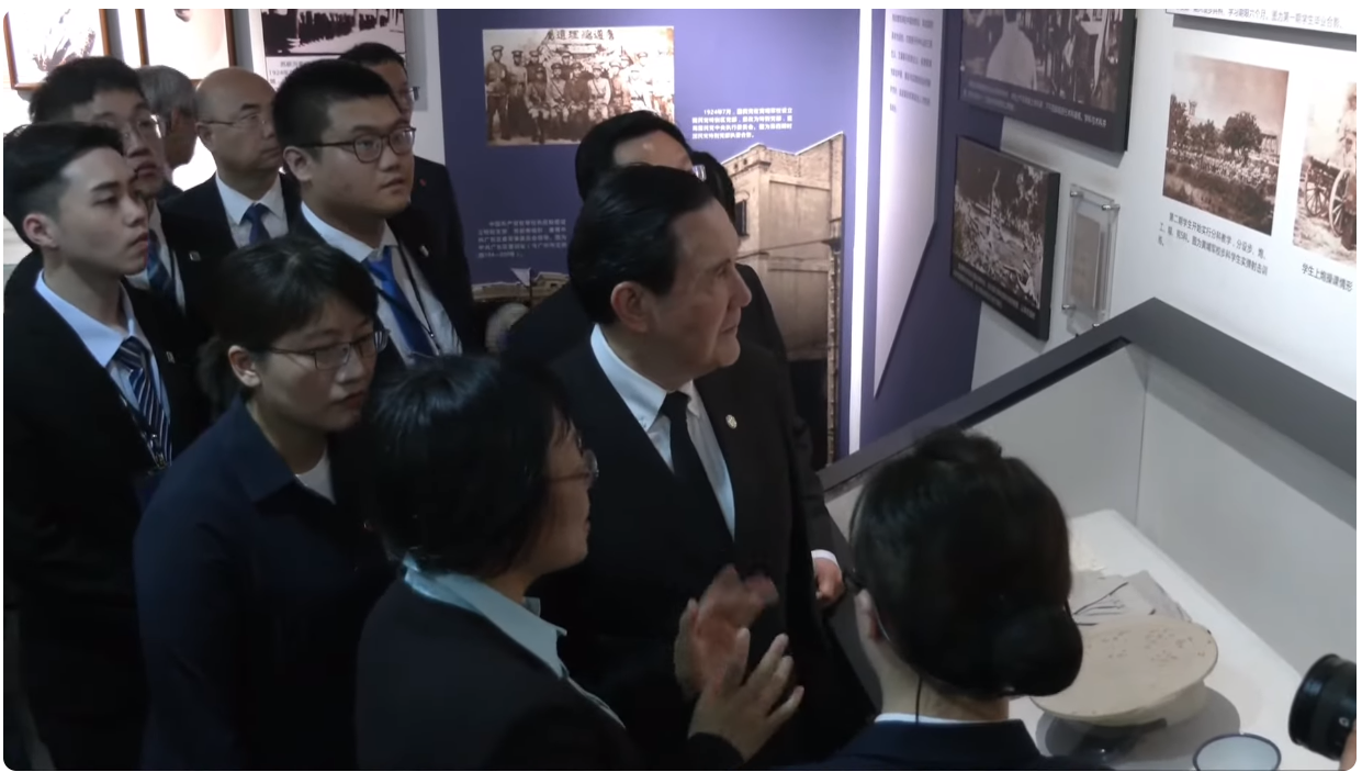 馬英九參訪黃埔軍校舊址 (“聯合新聞網”視頻畫面) 值得一提的是,參觀期間,馬英九相當關注黃埔軍校的裝修風格,提到這里的配色,與自己去年來大陸的時候,在武漢看到的(此處應指鄂軍都督府)、南京總統府一樣,都是深咖啡色。他還提到自己8年執政任期,辦公室的風格與黃埔軍校的一致。 參觀完建築與校舍後,馬英九一行前往展廳觀看展覽,期間解說員介紹了加入中國共產黨的黃埔一期學生左權在抗日戰爭中犧牲,以及同樣犧牲於抗戰時期的中共黨員趙一曼家書,馬英九詳細聆聽,並眼眶泛紅。
