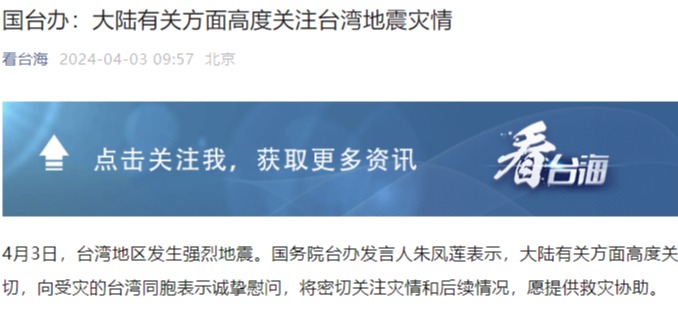 通說:台灣強震 兩岸揪心4月3日上午,台灣花蓮縣發生強烈地震,這是過去25年來台灣規模最大的一次地震,同時造成大量人員傷亡,讓身處海峽對岸的大陸人民也感到揪心。