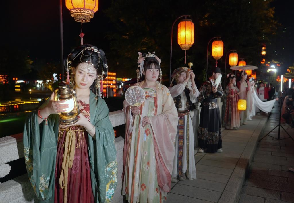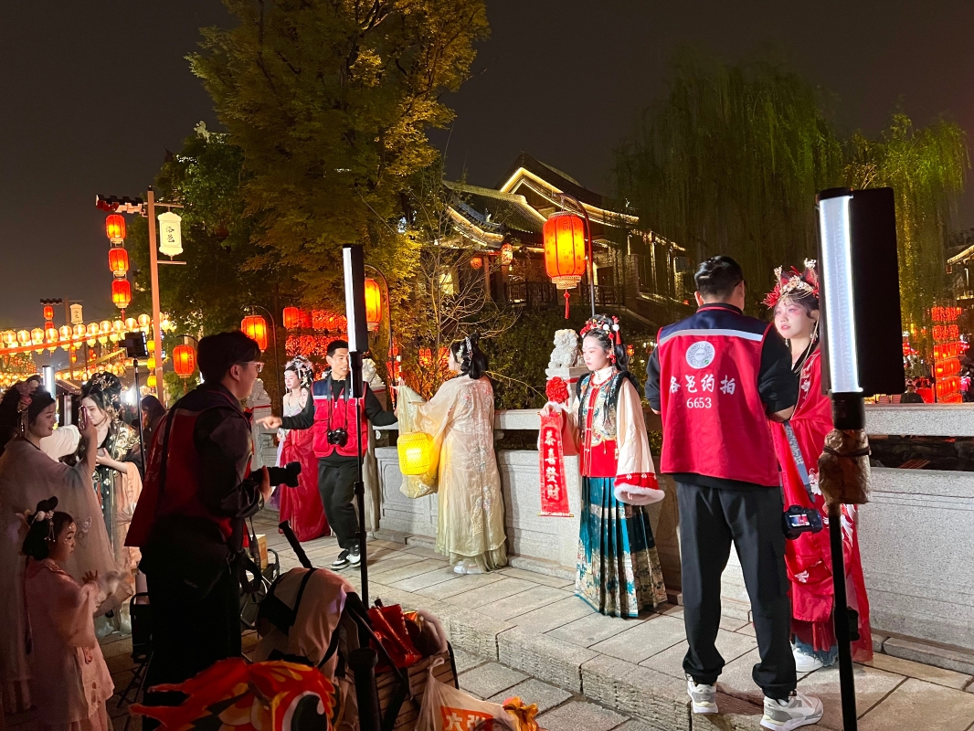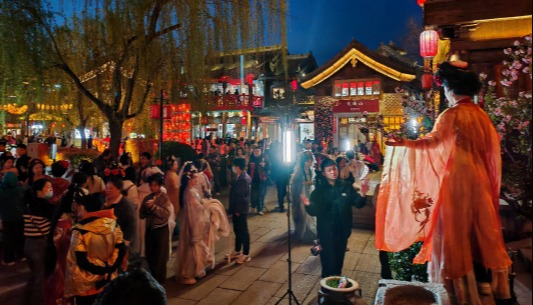 香港中通社記者近日到訪洛邑古城,華燈初上,裙裾飛揚,穿越的氣息撲面而來,宛如又見大唐盛世。古今交織,穿漢服吃火鍋、騎單車的景象,在洛陽街頭毫不突兀。古城邊的街道上,有長幾百米的漢服店,據了解洛陽現有近500家漢服店為旅客提供全方位服務。