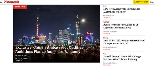 駐美大使:應該擔心的不是中國經濟會不會“崩潰”,而是……香港新聞網4月6日電 4月5日,中國駐美國大使謝鋒就“新質生產力”和中國經濟形勢接受美國《新聞周刊》(Newsweek)高級外交政策記者湯姆·奧康納專訪,訪談內容當日在該周刊網站刊登。主要內容如下: