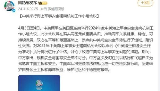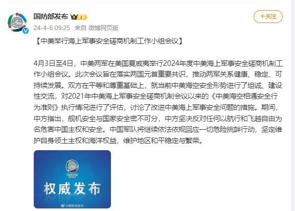 香港中通社4月6日電 4月3日至4日,中美兩軍在美國夏威夷舉行2024年度中美海上軍事安全磋商機制工作小組會議。此次會議旨在落實兩國元首重要共識,推動兩軍關係健康、穩定、可持續發展。
