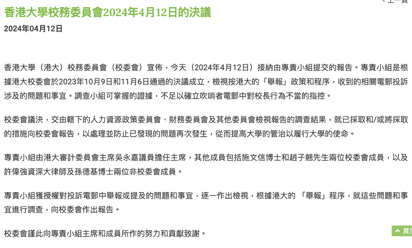 香港大學校務委員會12日晚間宣佈,接納由專責小組提交的報告。專責小組是根據港大校委會於2023年10月9日和11月6日通過的決議成立,檢視按港大的“舉報”政策和程序,收到的相關電郵投訴涉及的問題和事宜。調查小組可掌握的證據,不足以確立吹哨者電郵中對校長行為不當的指控。 張翔發表聲明稱,會加強與校委會的溝通,帶領管理層推進大學的改革,繼續提高效率。(完) 【編輯:陈卓仪】