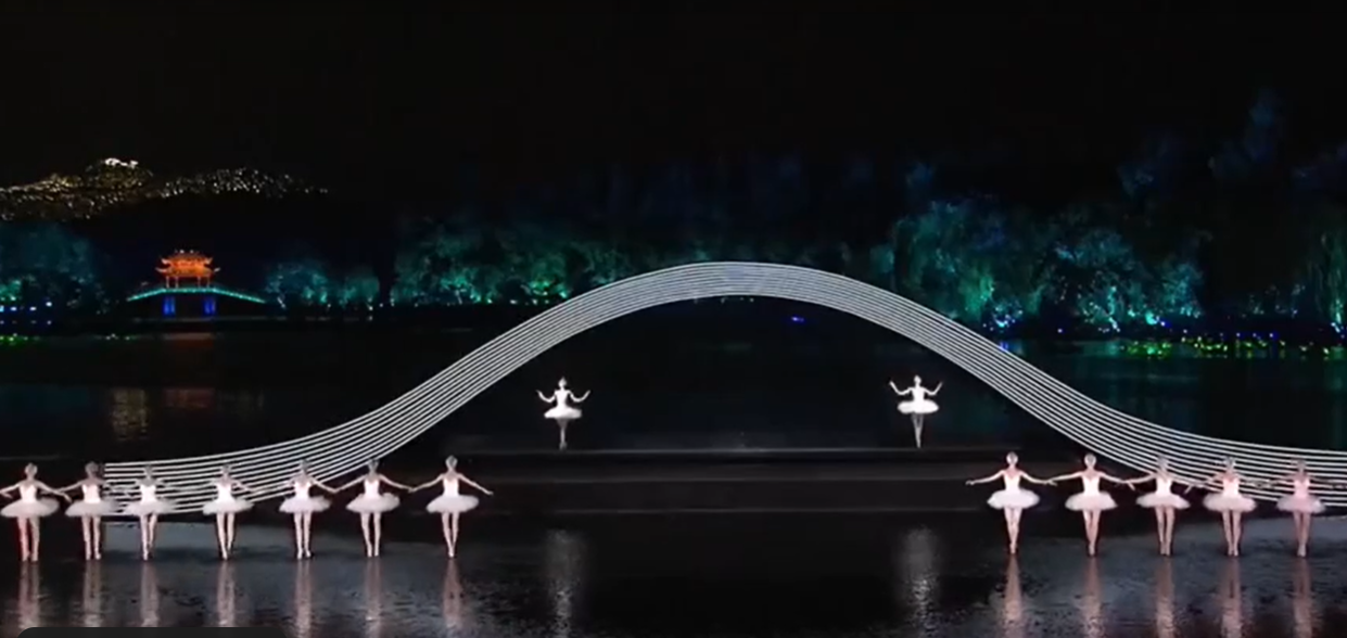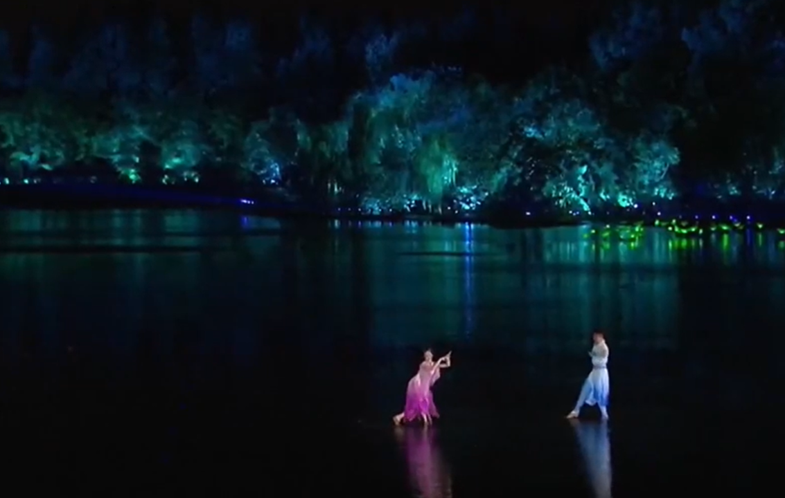 西湖。 第六站:"印象.西湖"演出 “印象西湖”坐落於的岳湖景區,每個寂靜的夜晚,在迷人的西子湖上,如詩如畫的江南美景和流傳千古的美妙傳說,都將在夜色和記憶里浮現綻放。如果說白天西湖顯露出她美麗的容貌,那麼夜晚她將會述說自己動人的故事。