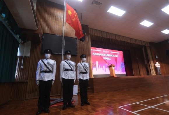 香港新聞網4月15日電 為響應“全民國家安全教育日”,香港特區政府保安局帶領轄下紀律部隊15日早上8時在香港警察學院聯合舉行升旗儀式,由政務司司長陳國基主禮。保安局局長鄧炳強、警務處處長蕭澤頤、海關關長何珮珊等紀律部隊首長出席。 升旗儀式開始前,警察銀樂隊在場奏樂,之後各紀律部隊代表步操進場列隊。升旗儀式於早上7時50分開始,警察護旗方隊進場,現場奏唱國歌,並進行升旗。 陳國基在致辭時說,國安才能港安,國安才能家安,國家安全是社會繁榮穩定,市民安居樂業的根本,自香港國安法出台實施,立竿見影,止暴制亂,讓香港迅速回復穩定。