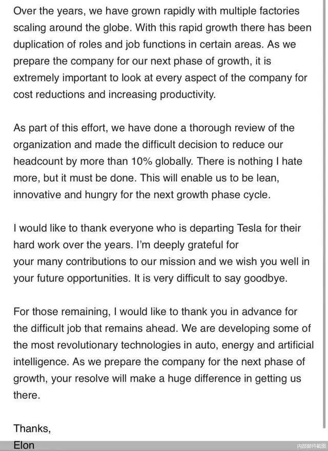 馬斯克在電子郵件中稱,特斯拉的“快速增長”導致了“某些領域的角色和工作職能的重複”。“為公司下一階段的增長做好準備,審視公司的各個方面以降低成本和提高生產率是極其重要的。” 馬斯克說,經過徹底審查,做出艱難的決定,將全球員工人數減少10%以上。他表示這將使公司保持精簡、創新并進入下一個增長周期。 在談及特斯拉的未來時,馬斯克稱,特斯拉正在研究汽車、能源和人工智能領域的一些最具革命性技術。 特斯拉提交給監管機構的一份最新文件顯示,截至去年12月,特斯拉在全球擁有員工數量超14萬人,此次裁員將影響超過1.4萬名員工 。 這是特斯拉自2017 年以來第五次大規模裁員 。據悉,2017年該公司將員工人數減少了 2%,此後,在2018年、2019年和2022年又分別減少了團隊的9%、7%和3%。 特斯拉季度交付量 4年來首次出現下降 根據特斯拉公佈的數據,今年第一季度特斯拉汽車交付量同比下降8.5%至約38.68萬輛,這是特斯拉近四年來的首次下降 ,也低於市場預期。馬斯克曾表示,特斯拉在2024年的增速可能會明顯低於2023年。 按美聯社說法,特斯拉銷量比華爾街分析師最不樂觀的估計還要低 。汽車行業分析師先前預測,特斯拉一季度交付量將達45.7萬輛。特斯拉定於4月23日公佈季度財報,電動車銷量下降促使分析師下調對其盈利情況的預測值。 特斯拉公司將銷量下降的部分原因歸結為其Model 3車型改款影響產量,紅海局勢緊張影響海運導致工廠關閉,以及特斯拉德國工廠上月因高壓輸電塔遭人為縱火破壞而供電中斷。 與此同時,據美聯社報道,美國電動車市場增長放緩。該國電動車銷量去年增長47%至119萬台,電動車市場份額上昇至7.6%,但臨近年底增長步伐放慢,去年12月銷量同比增長34%。(完) 【編輯:俞丹鳳】