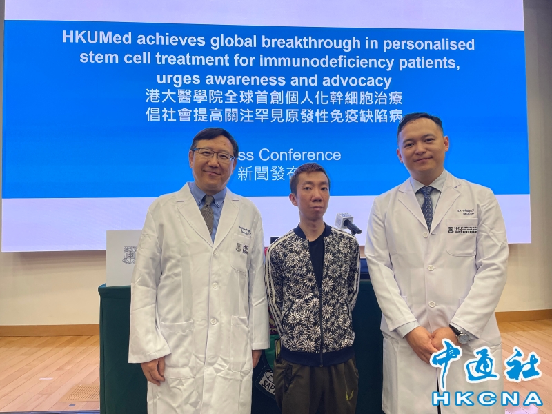 (香港中通社記者陳偉根 攝) 香港中通社圖片 原發性免疫缺陷病是一種罕見病。其中一個例子是STAT1功能增益症(STAT1-GoF),患者先天免疫系統有遺傳缺陷,使他們容易受到致命感染,或患有自身免疫疾病、動脈瘤和癌症等。 香港大學醫學院夥香港幹細胞轉化研究中心、劍橋大學,共同開創新型幹細胞平台,幫助原發性免疫缺陷病患者。研究團隊通過患者的血細胞,生成擴展潛能幹細胞,用於實驗性基因編輯,幫助患者找到最有效和安全的治療方案。團隊目前已經成功運用風濕病藥物治療STAT1功能增益症患者。 發佈會現場,29歲罹患STAT1功能增益症病人表示,自己三歲時發病,但直到十多歲時才確診,身體多個器官受損,多次感染念珠菌導致全身皮膚潰爛。在20多歲時還因血管瘤導致中風,視力亦一度失去九成。他接受個人化幹細胞治療後,情況大幅好轉,目前可以正常工作生活。 李曦表示,個人化幹細胞療法成功為罕見免疫疾病患者提供安全、有效和新穎的治療選擇。許多過去被認為無法治癒的疾病,如今通過使用已有藥物和探索其基因治療的潛力,可為醫療專業人員和患者帶來新希望。 李曦指出,免疫缺陷病和罕見疾病的患者往往屬於弱勢社群,經常面對延誤診斷及缺乏支援,支付昂貴的治療費用。他呼籲社會提高對這些疾病的認識,並為患者提供有力支持。(完) 【編輯:纪东】